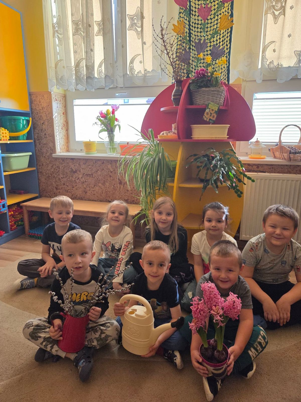 Poznały kwiaty wiosenne – hiacynty, tulipany i narcyzy. Do flakonu włożyły gałęzie forsycji, aby obserwować jej kwitnienie. Podczas zajęć edukacyjnych ,,mali przyrodnicy” dowiedzieli się jakie są niezbędne warunki do rozwoju roślin.