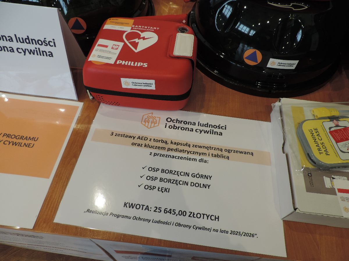 Efektem otrzymanej dotacji w ramach umowy na wydatki bieżące był zakup 3 zestawów AED wraz z torbą, kapsułą zewnętrzną i kluczem pediatrycznym na potrzeby jednostek OSP w Borzęcinie Górnym, Dolnym oraz OSP Łęki, na kwotę 25 645,00 zł. Nabycie tego rodzaju urządzeń wpisuje się w zadania obrony cywilnej, ukierunkowane na ochronę życia i zdrowia mieszkańców, głównie w miejscach publicznych oraz podczas działań kryzysowych, a także w miejscu, gdzie gromadzi się duża liczba osób. Pozostała część dotacji na wydatki bieżące została przeznaczona na dostawę i montaż 5 zestawów Systemu Powiadamiania Dźwiękowego o Ewakuacji w Zespołach Szkolno – Przedszkolnych: w Borzęcinie Górnym, Dolnym, Bielczy, Przyborowie oraz Publicznej Szkole Podstawowej w Łękach. Wartość zamontowanego sprzętu to kwota: 49 357,44 zł.