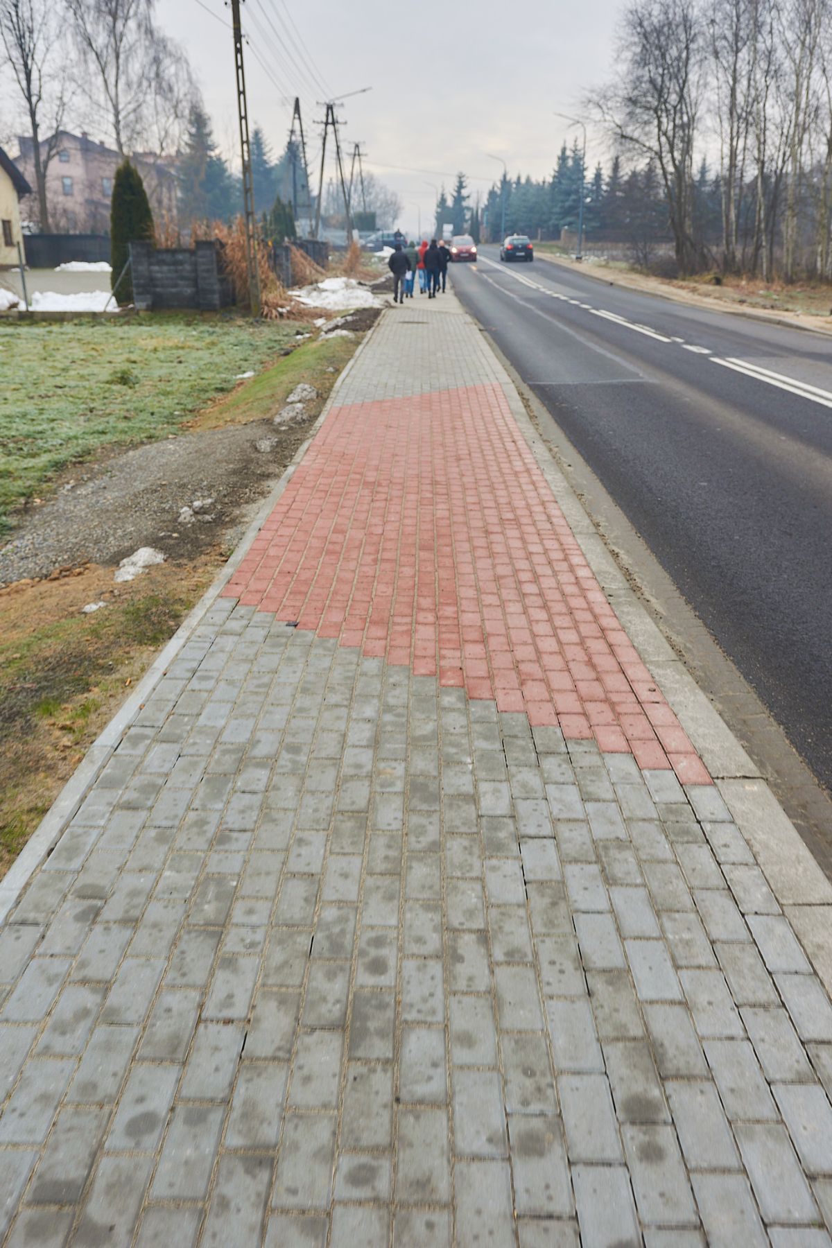 W ramach zadania wykonano jednostronny chodnik na długości 530m wraz z niezbędną infrastrukturą, tj. odwodnieniem (kanalizacją deszczową) po obu stronach drogi oraz doświetlone przejścia dla pieszych wraz z dojściami do nich. Roboty wykonała Firma: Kamil Krupa KAM-TRANS-KOP ze Strzelec Wielkich.