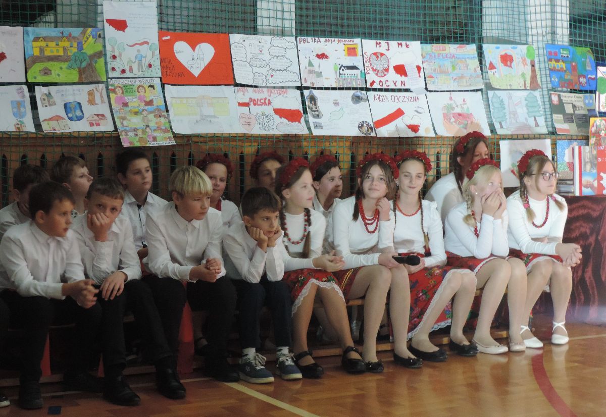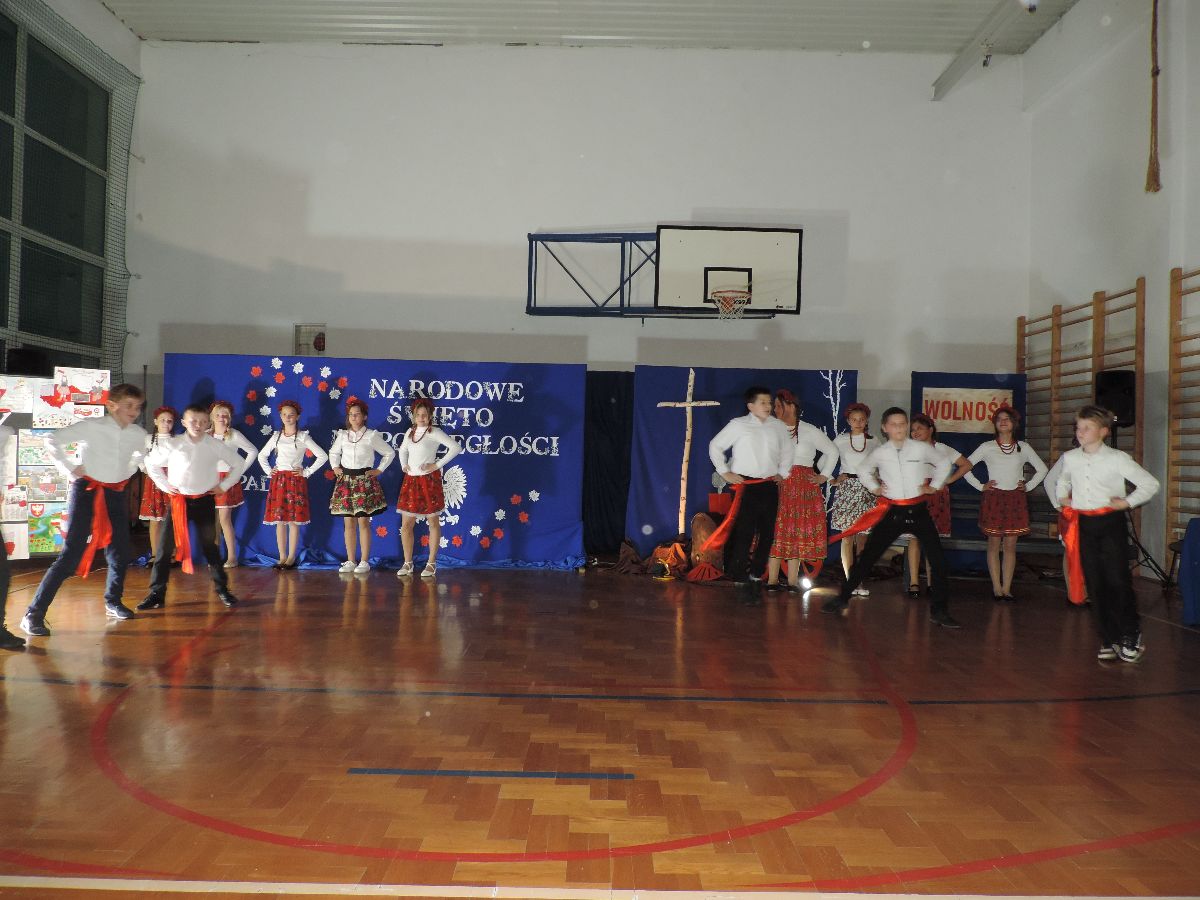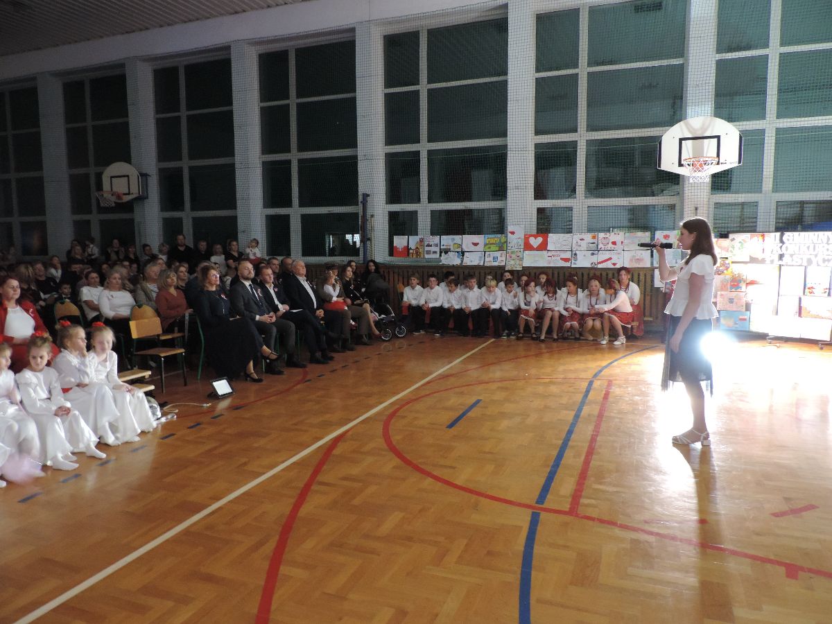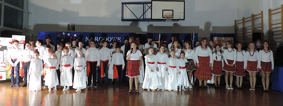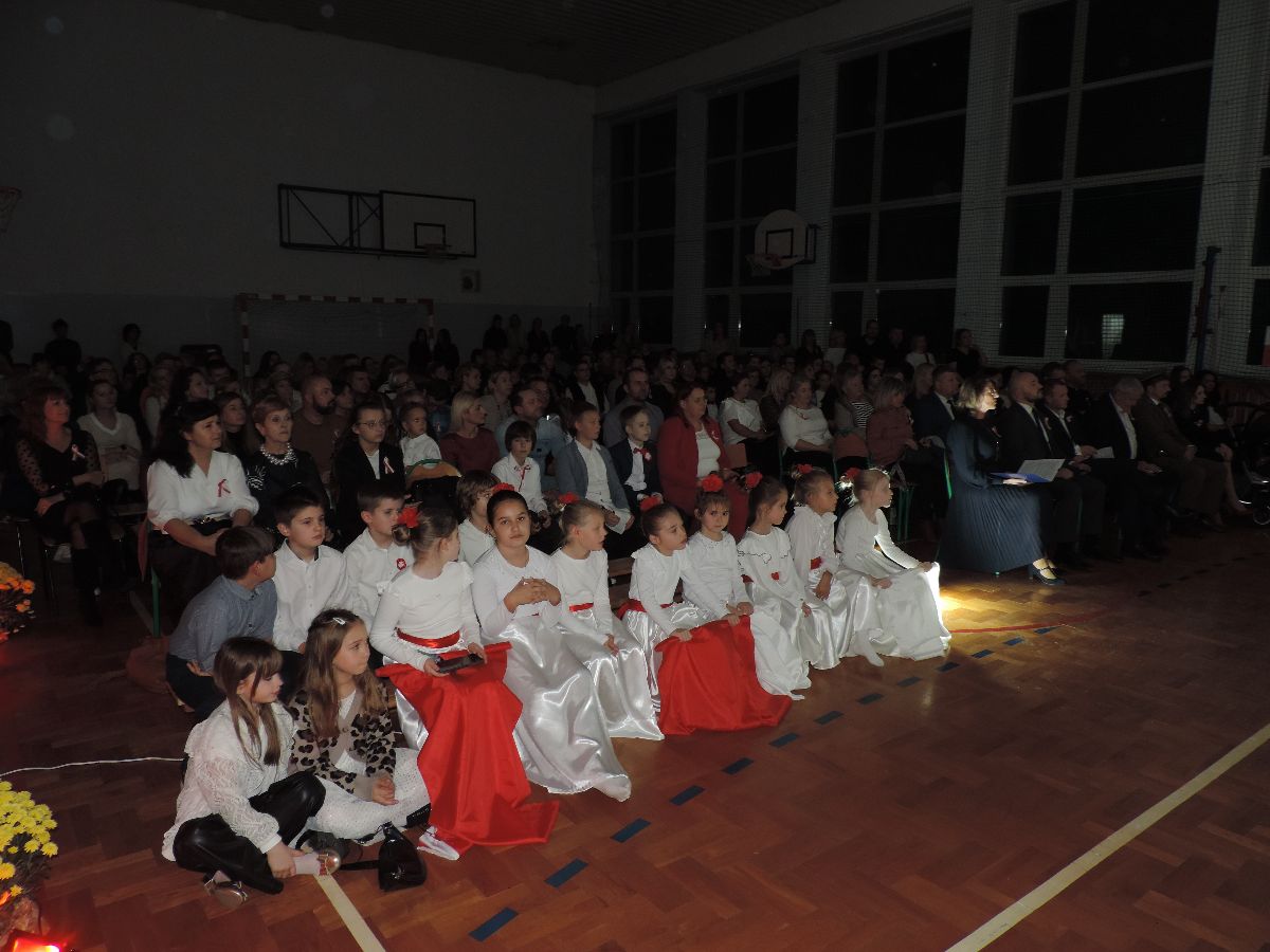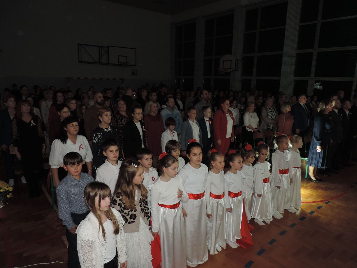 Na zakończenie wszyscy obecni zaśpiewali kilka pieśni patriotycznych, a następnie zostali ugoszczeni słodkim poczęstunkiem, który przygotowali rodzice z poszczególnych klas.