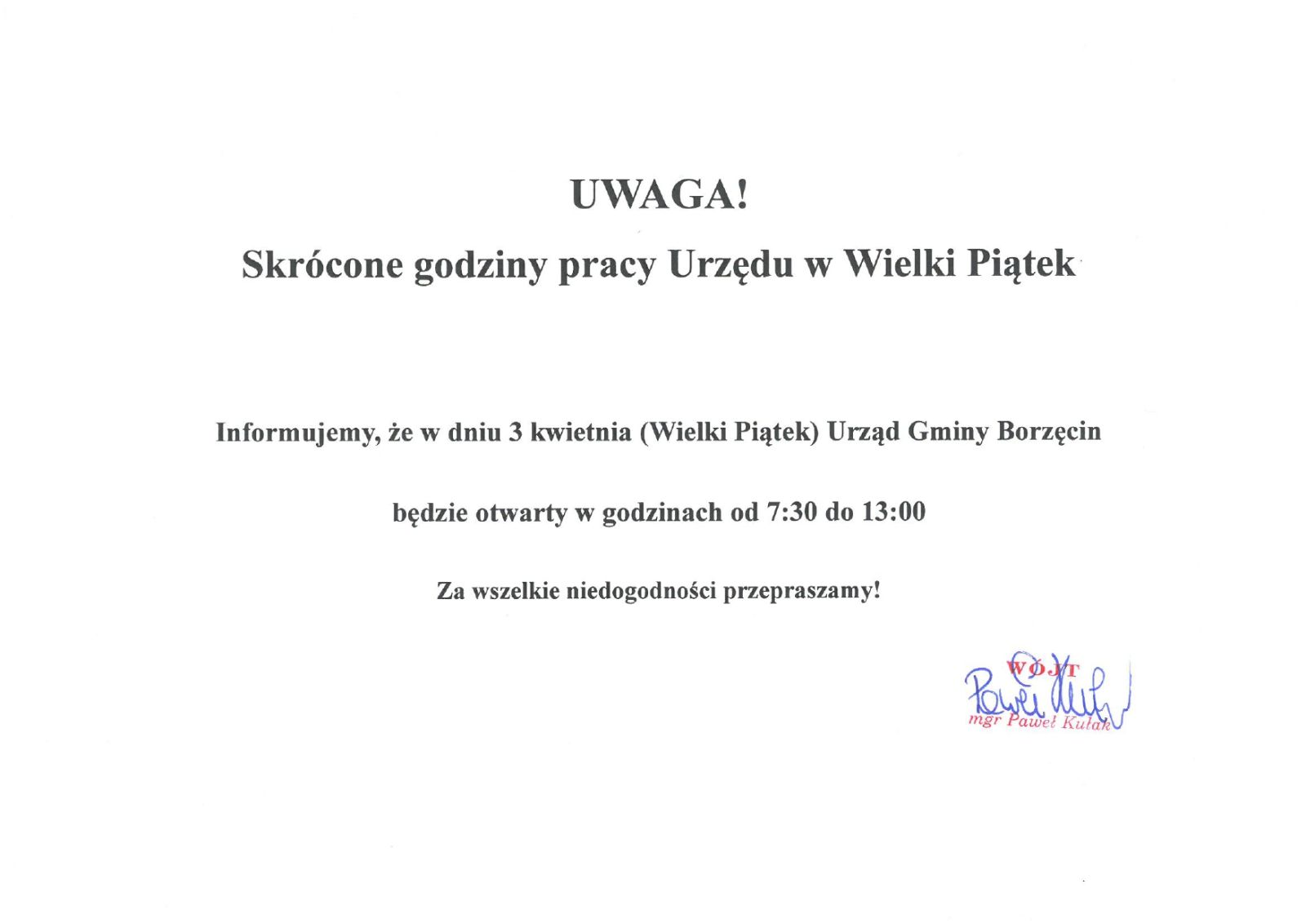 Informujemy, że w dniu 3 kwietnia (Wielki Piątek) Urząd Gminy Borzęcin będzie otwarty w godzinach od 7:30 do 13:00