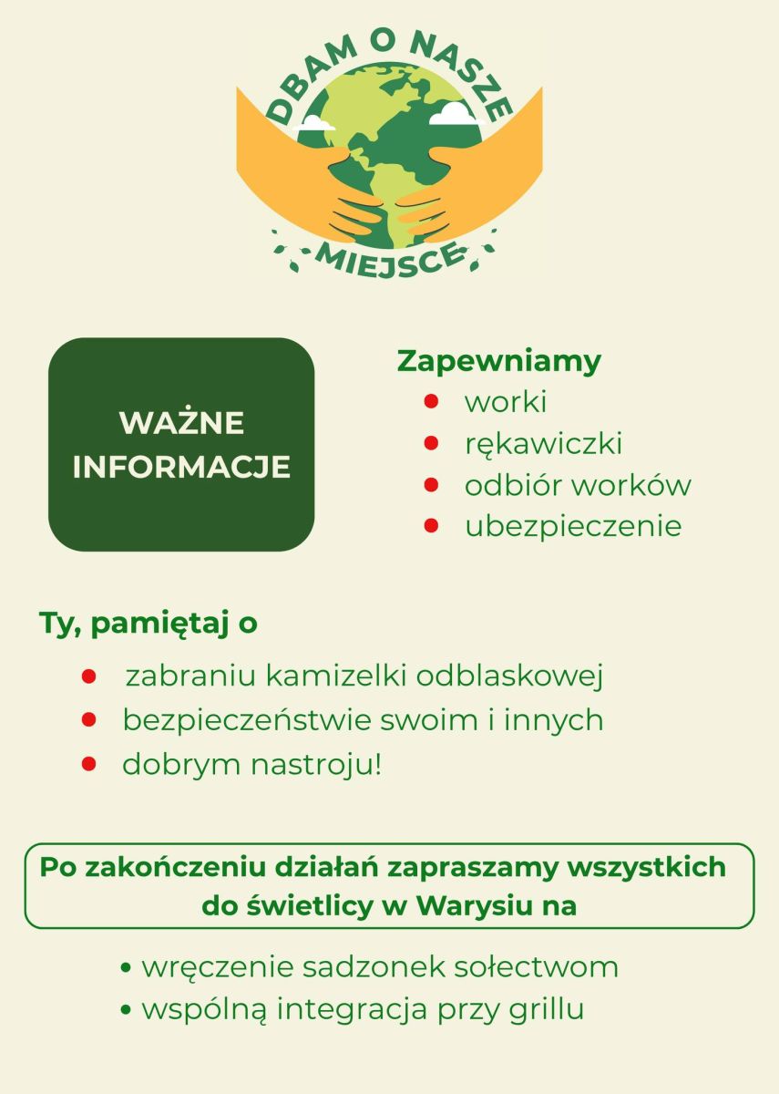 Zapraszamy mieszkańców z wszystkich sołectw do wzięcia udziału w akcji i późniejszej integracji przy grillu na terenie Świetlicy Wiejskiej w Warysiu!