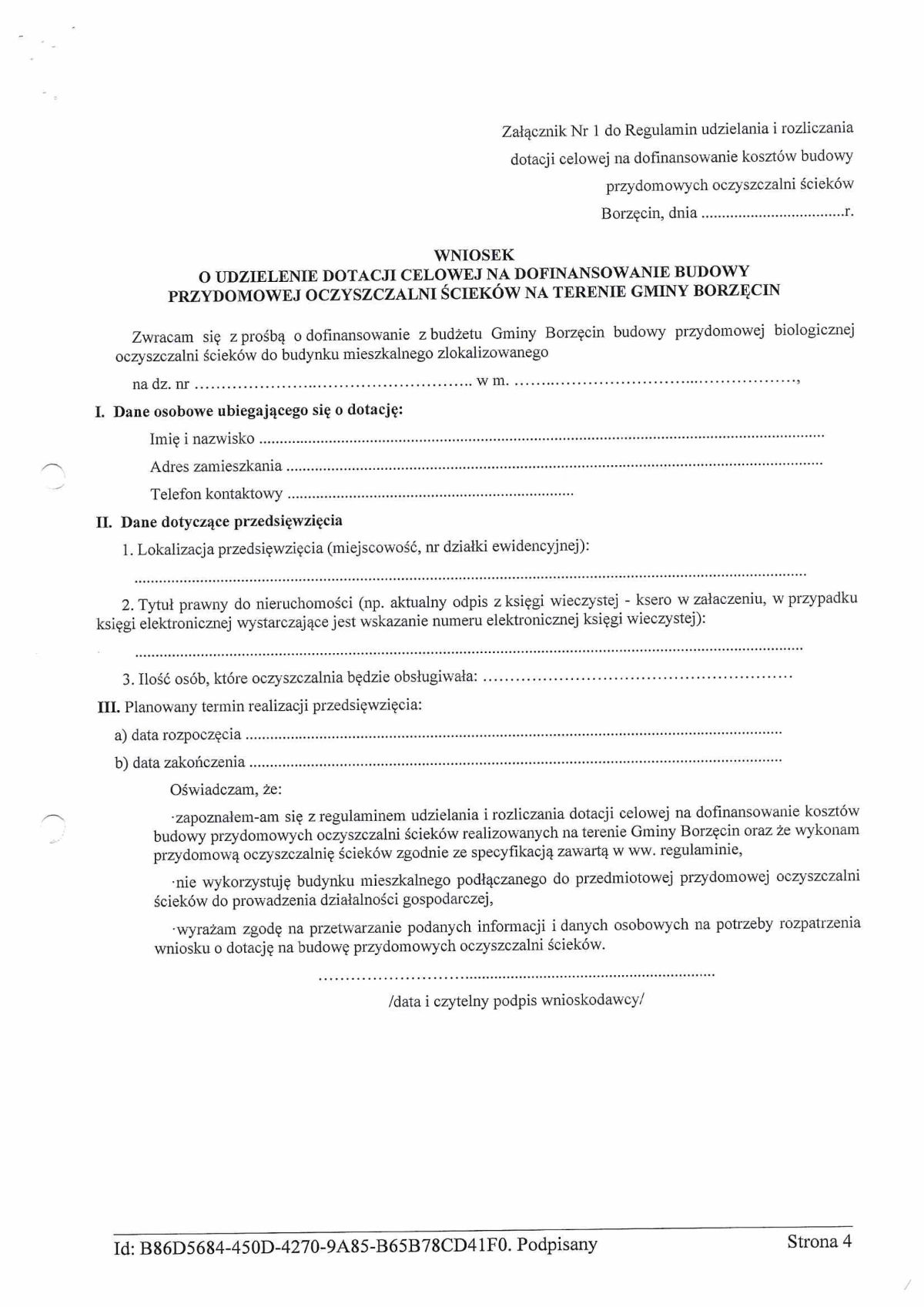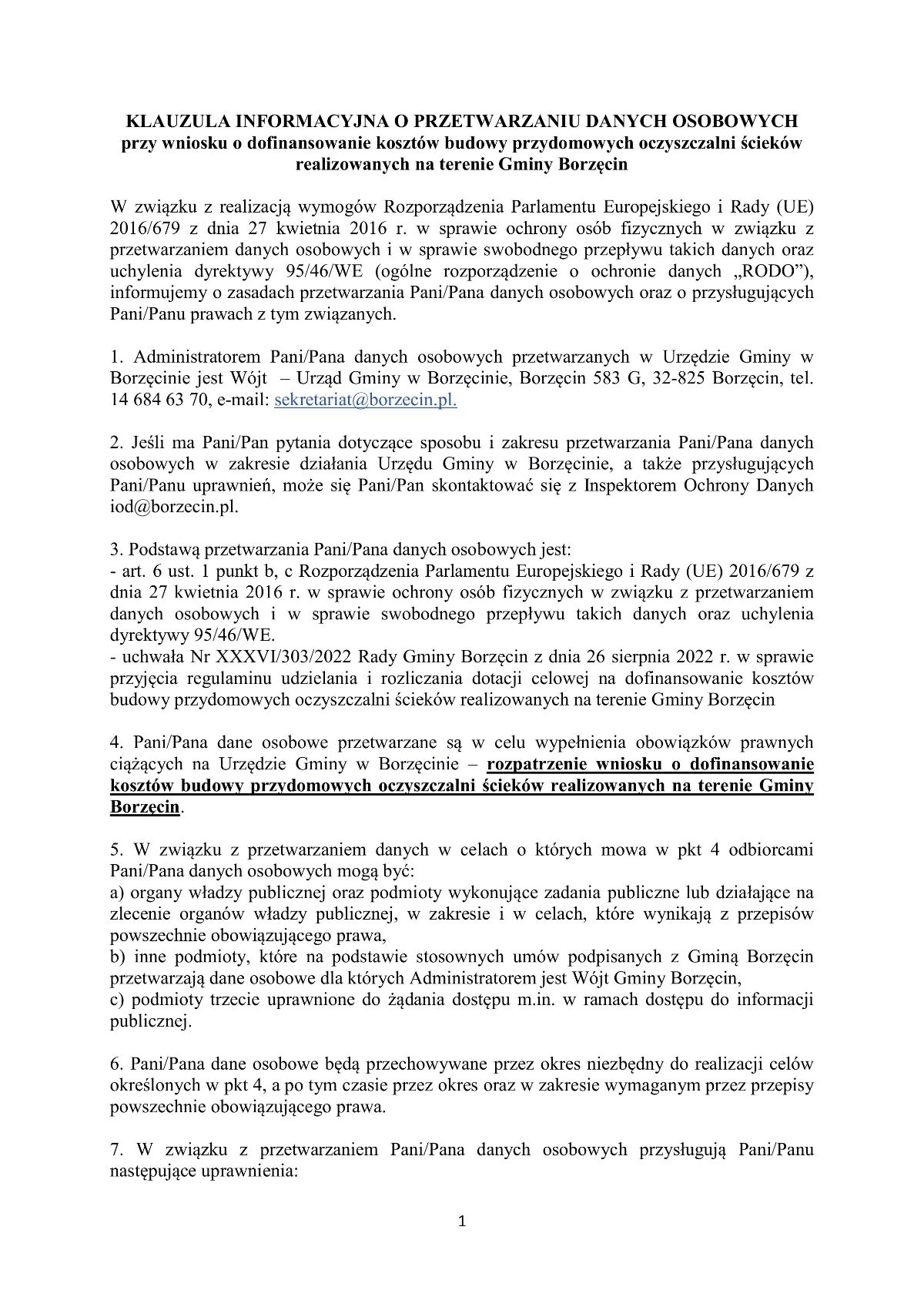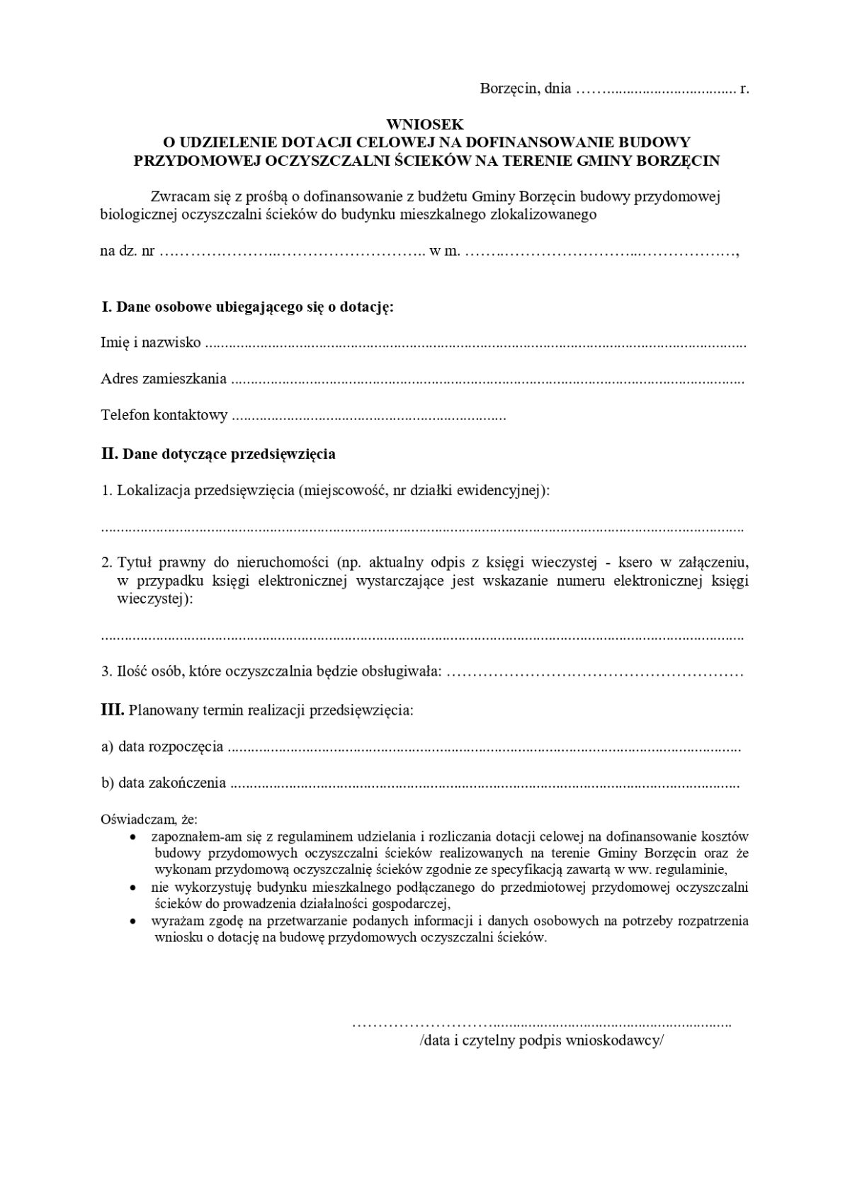 Regulamin udzielania i rozliczania dotacji celowej na dofinansowanie kosztów budowy przydomowych oczyszczalni ścieków realizowanych na terenie Gminy Borzęcin oraz wzory dokumentów są do pobrania na stronie internetowej Gminy Borzęcin www.borzecin.pl i w pok. nr 22 Urzędu Gminy Borzęcin. Dodatkowe informacje można uzyskać pod nr telefonu 146846104 lub bezpośrednio w siedzibie Urzędu Gminy Borzęcin.