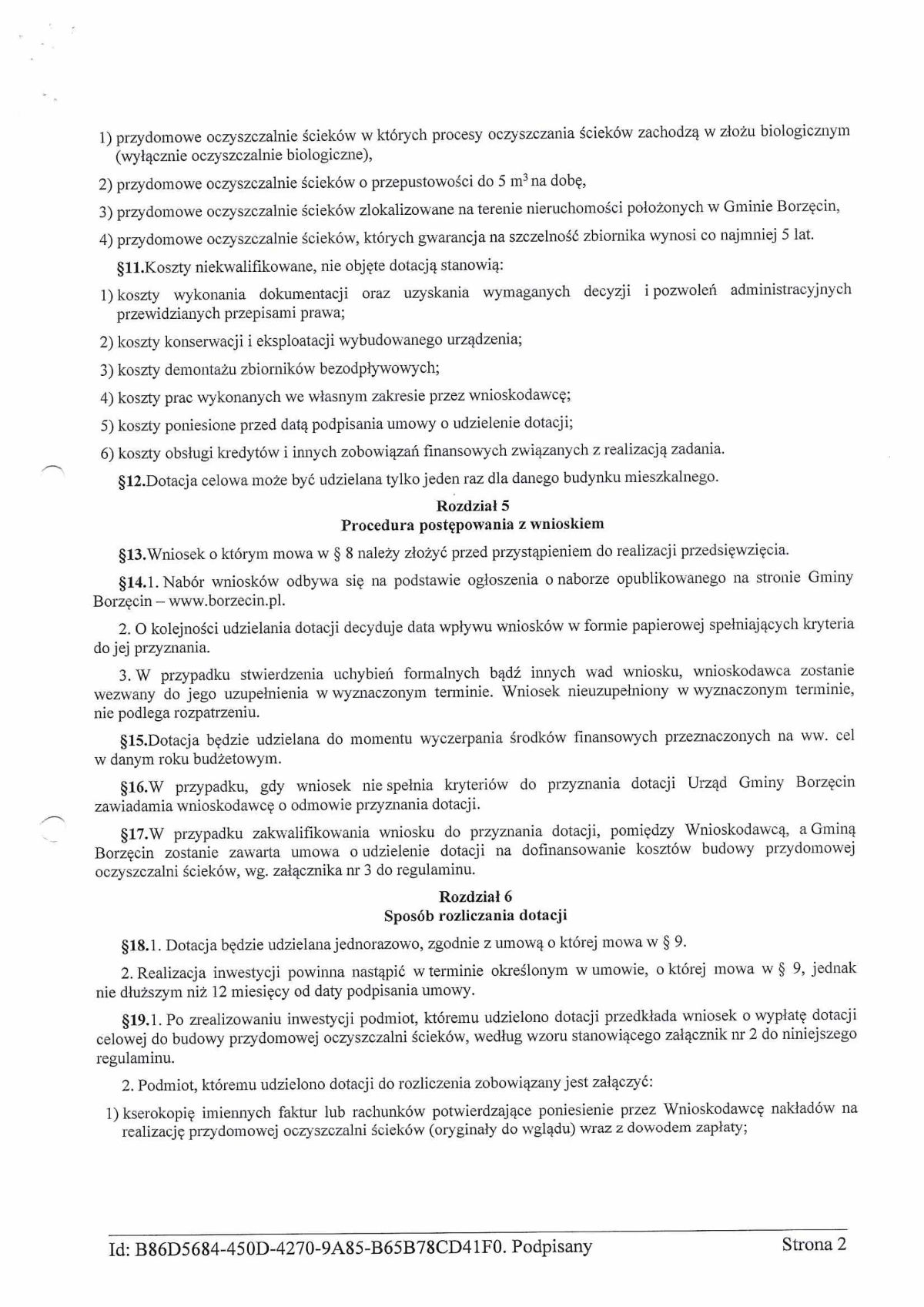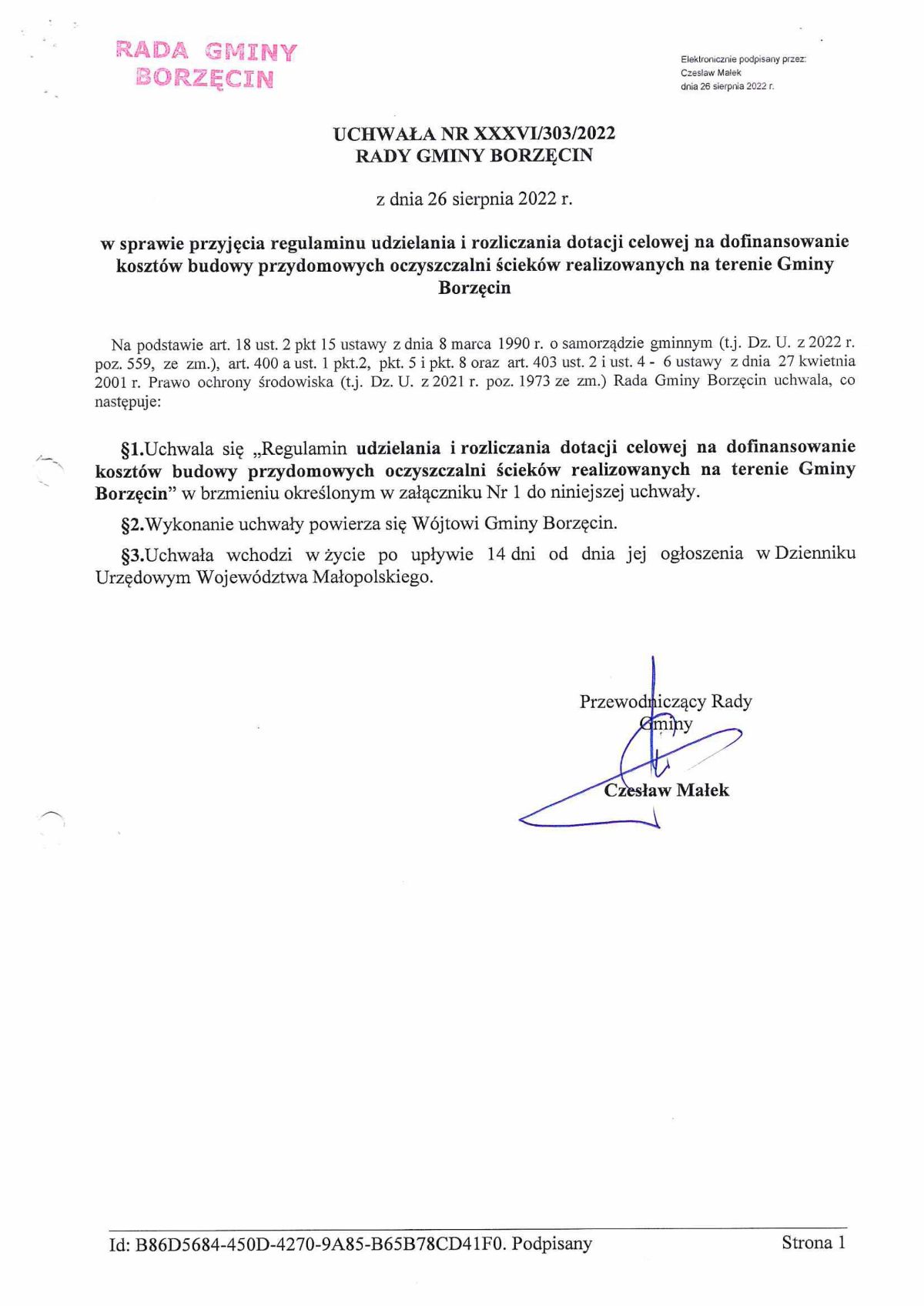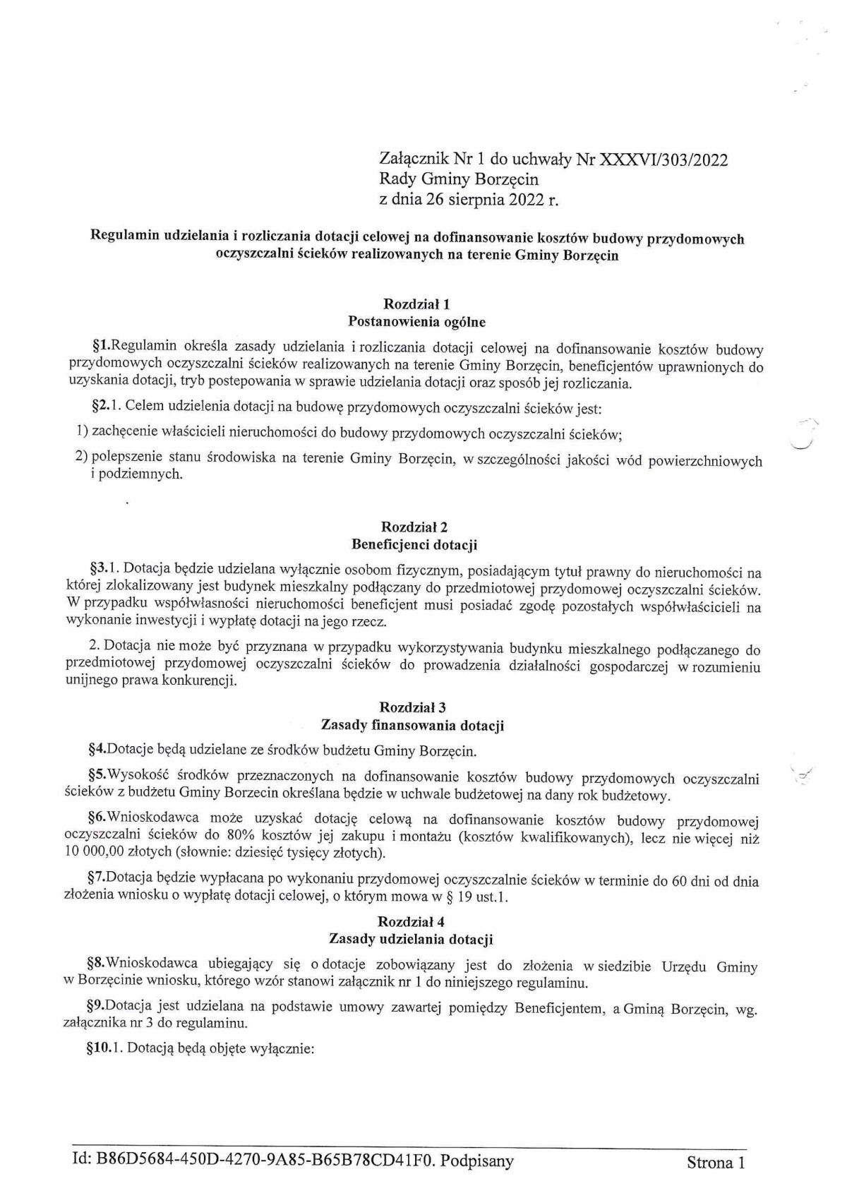 Przyznawanie dofinansowania odbywać się będzie zgodnie z uchwałą Nr XXXVI/303/2022 Rady Gminy Borzęcin z dnia 26 sierpnia 2022 r. w sprawie przyjęcia regulaminu udzielania i rozliczania dotacji celowej na dofinansowanie kosztów budowy przydomowych oczyszczalni ścieków realizowanych na terenie Gminy Borzęcin (Dz. Urz. Województwa Małopolskiego z 2022 r.,poz. 5623.
