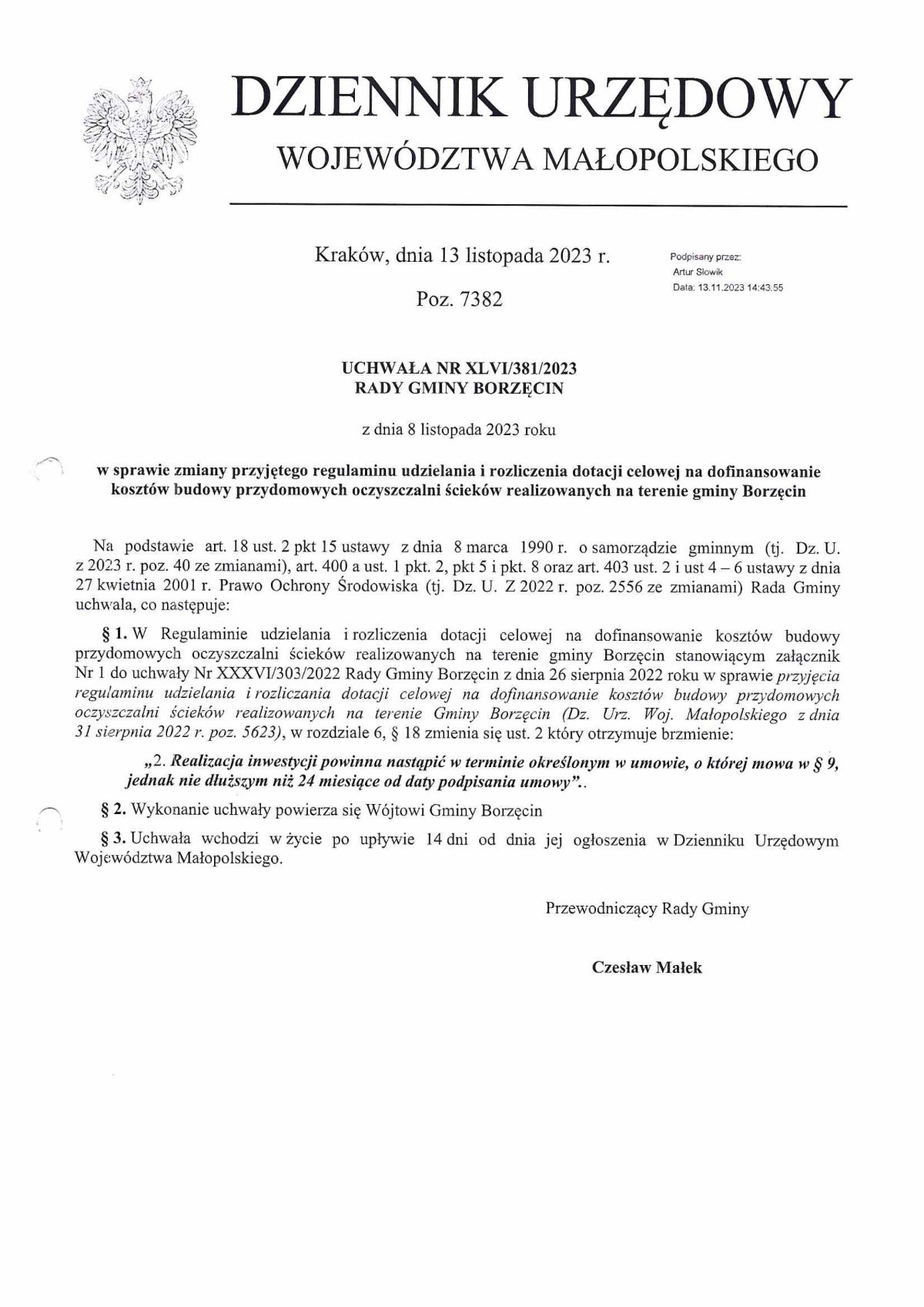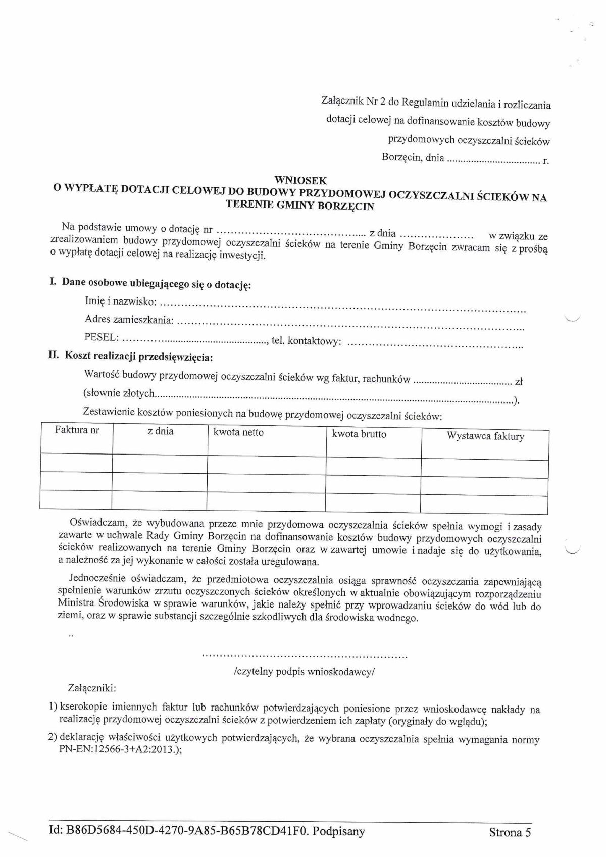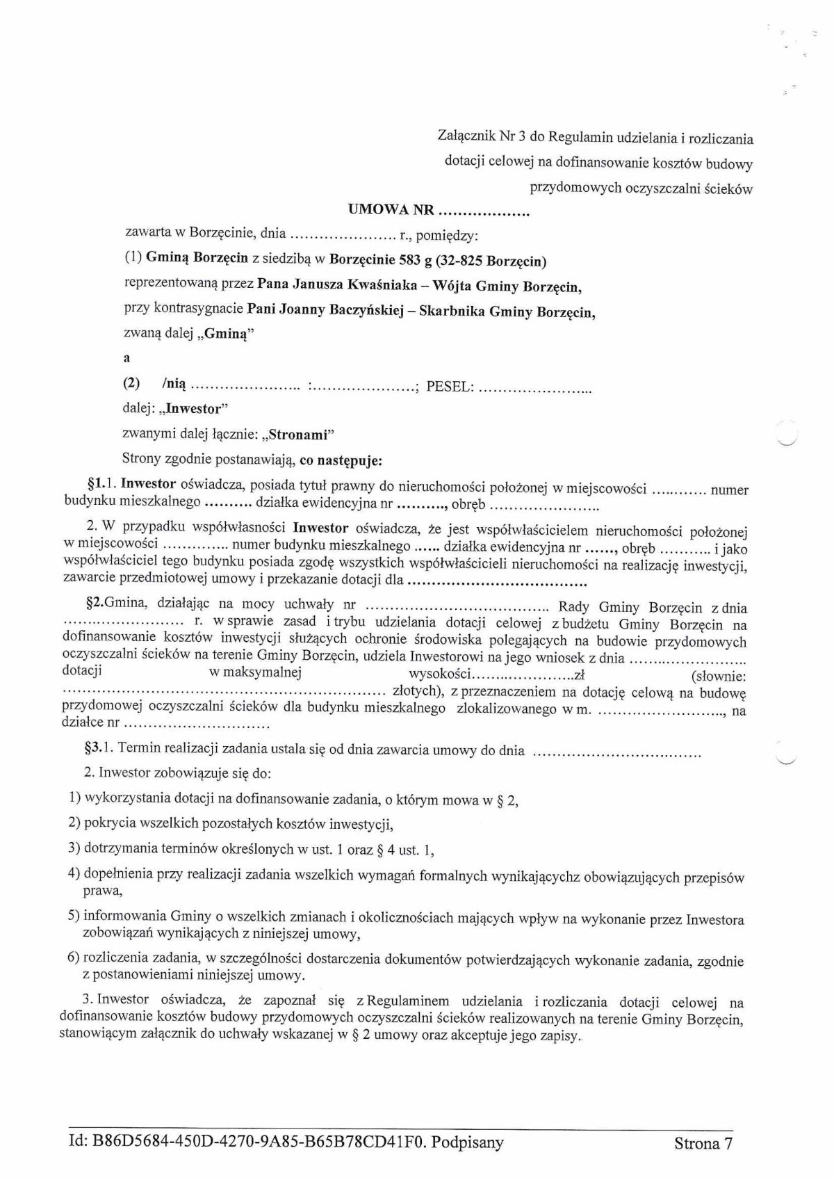 Przyznawanie dofinansowania odbywać się będzie zgodnie z uchwałą Nr XXXVI/303/2022 Rady Gminy Borzęcin z dnia 26 sierpnia 2022 r. w sprawie przyjęcia regulaminu udzielania i rozliczania dotacji celowej na dofinansowanie kosztów budowy przydomowych oczyszczalni ścieków realizowanych na terenie Gminy Borzęcin (Dz. Urz. Województwa Małopolskiego z 2022 r.,poz. 5623.