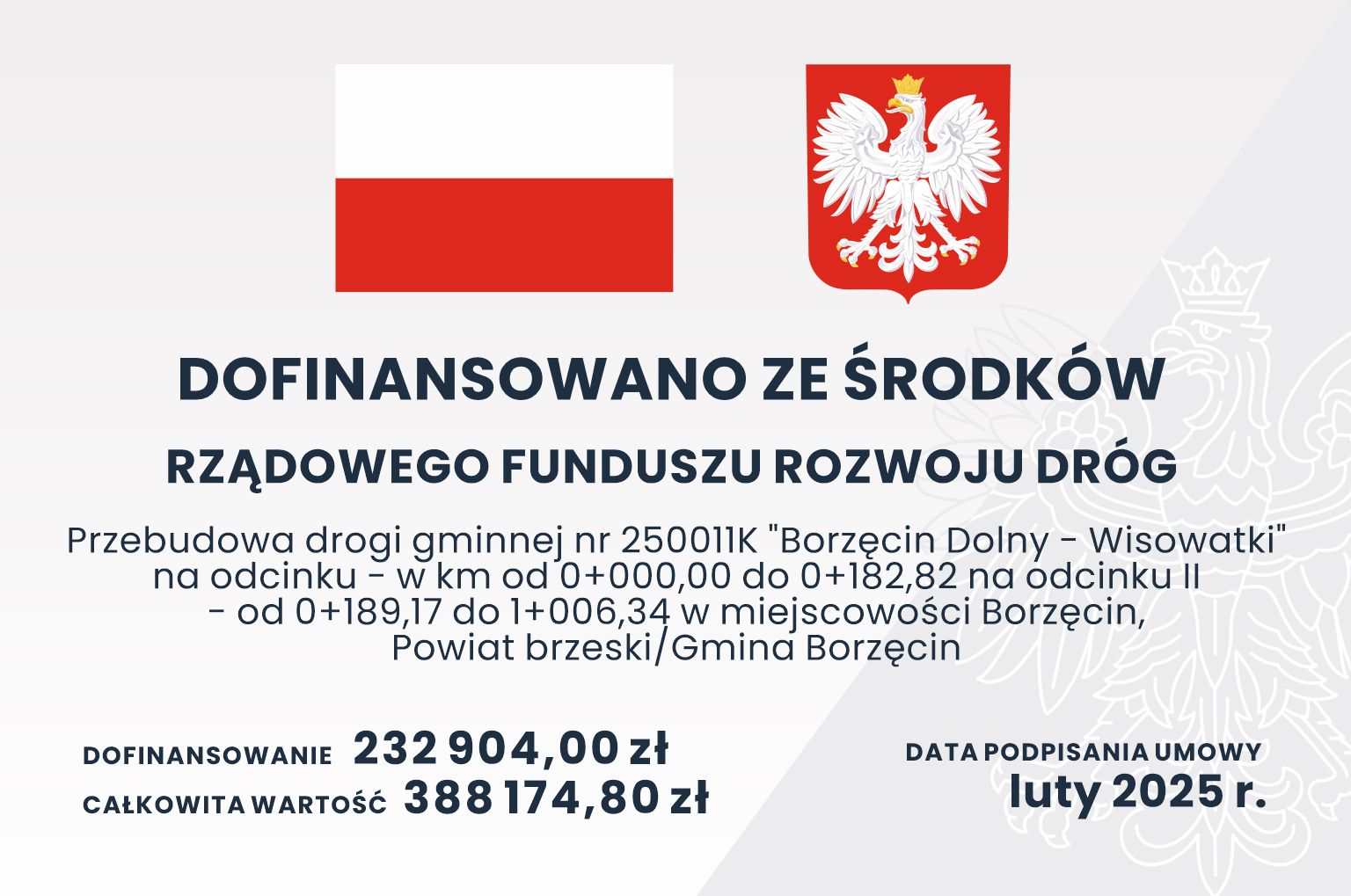 W roku 2025 r. Gmina Borzęcin pozyskała środki z Rządowego Funduszu Rozwoju Dróg na realizację zadania pn.: Przebudowa drogi gminnej nr 250011K "Borzęcin Dolny - Wisowatki" na odcinku - w km od 0+000,00 do 0+182,82 na odcinku II - od 0+189,17 do 1+ 006,34 w miejscowości Borzęcin, Powiat brzeski/Gmina Borzęcin.