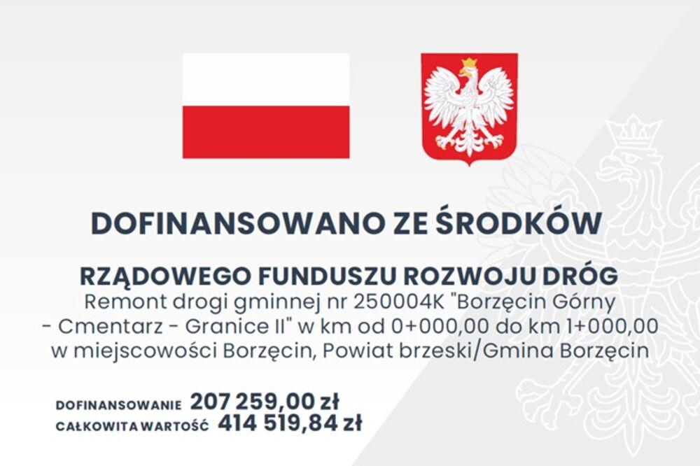 W roku 2023r. Gmina Borzęcin pozyskała środki z Rządowego Funduszu Rozwoju Dróg na realizację zadania pn.: Remont drogi gminnej nr 240004K „Borzęcin Górny - Cmentarz - Granice II”  w km od 0+000,00 do km 1+000,00 w miejscowości Borzęcin, Powiat brzeski/Gmina Borzęcin.