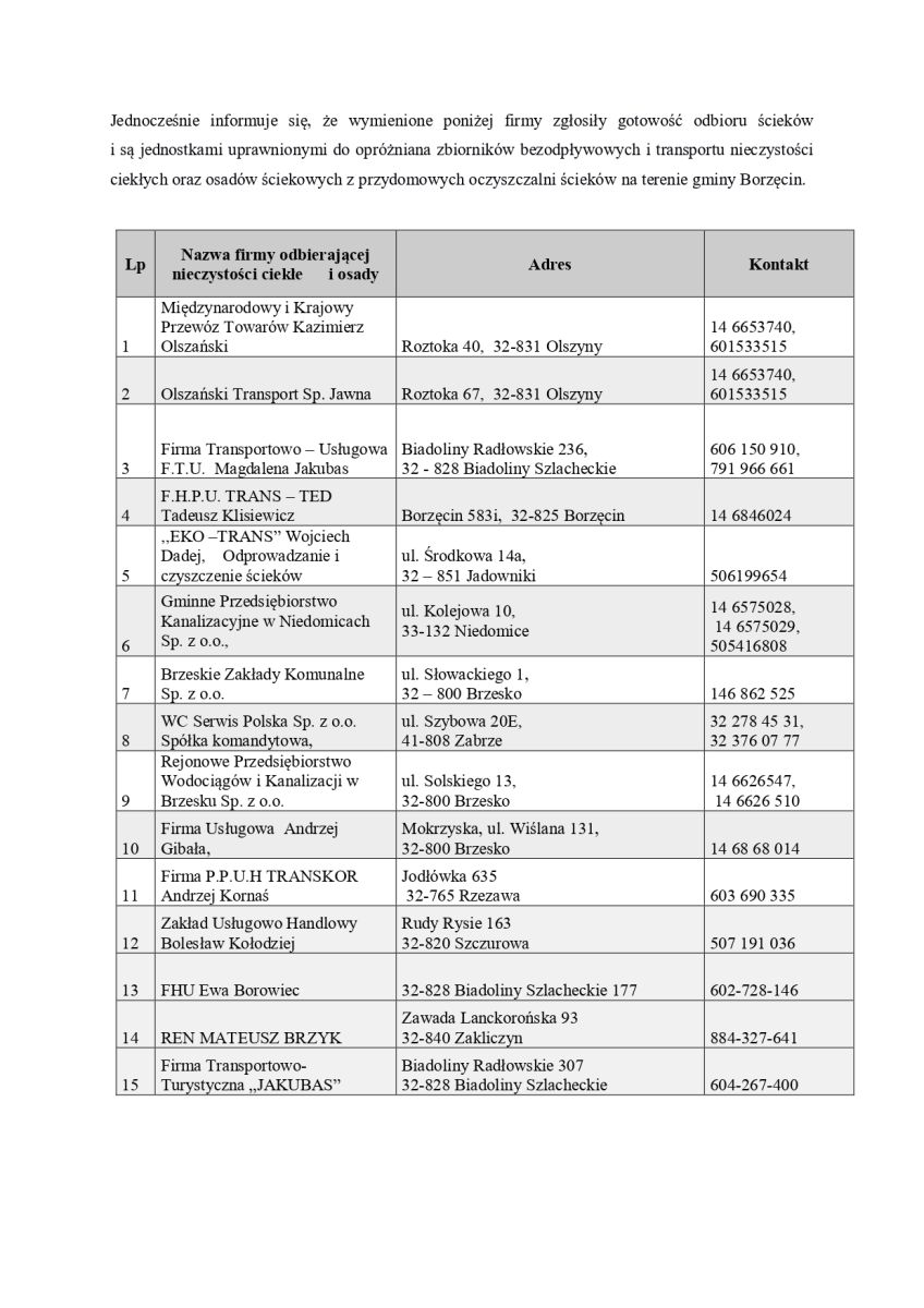 Dokument do pobrania - Wykaz uprawnionych firm do opróżniania zbiorników bezodpływowych, przydomowych oczyszczalni i transportu nieczystości ciekłych na terenie Gminy Borzęcin (JPG, 143.88 KB)